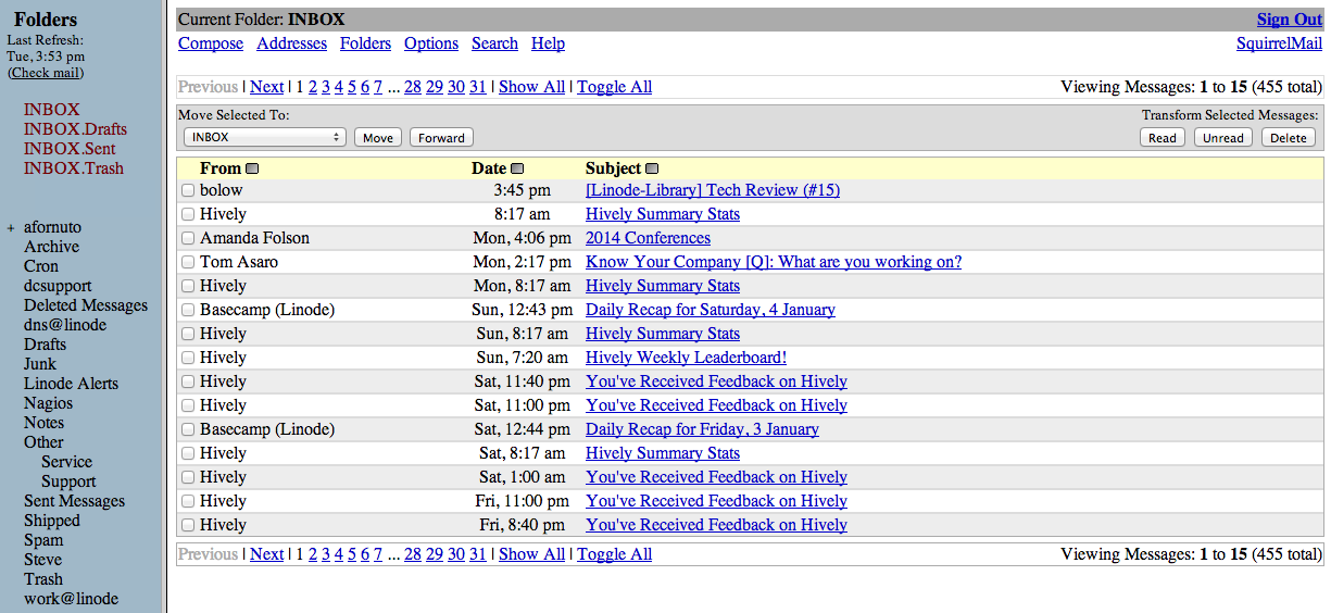 1. At this point you should be able to log in to the SquirrelMail Login page using your email credentials. Navigate in your web browser to the Linode’s IP address, or domain name depending on how you’ve configured the virtual host: