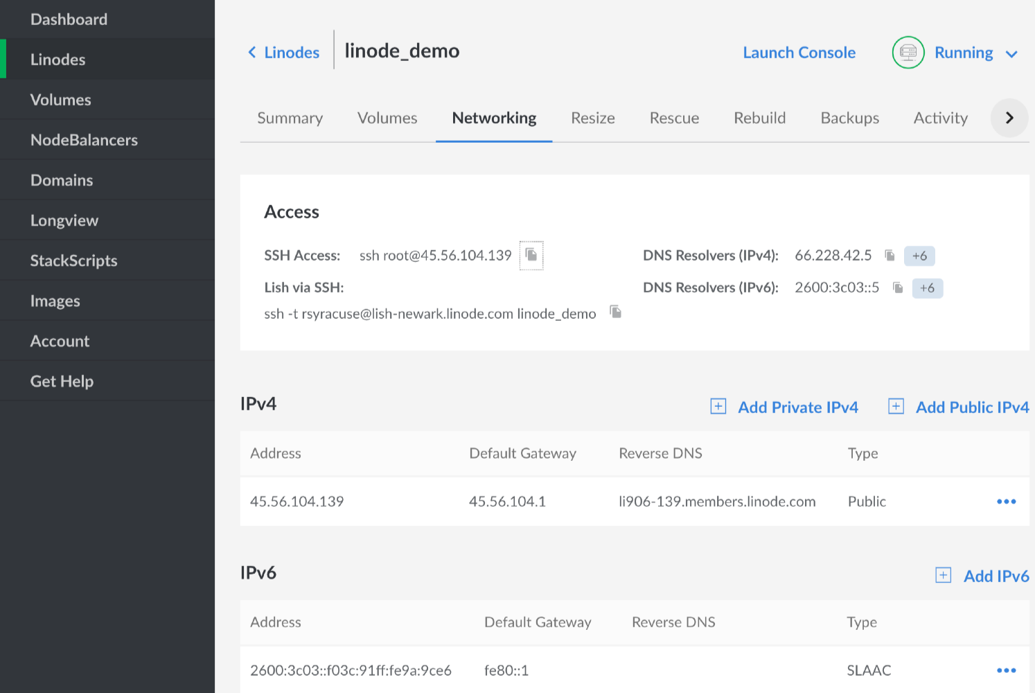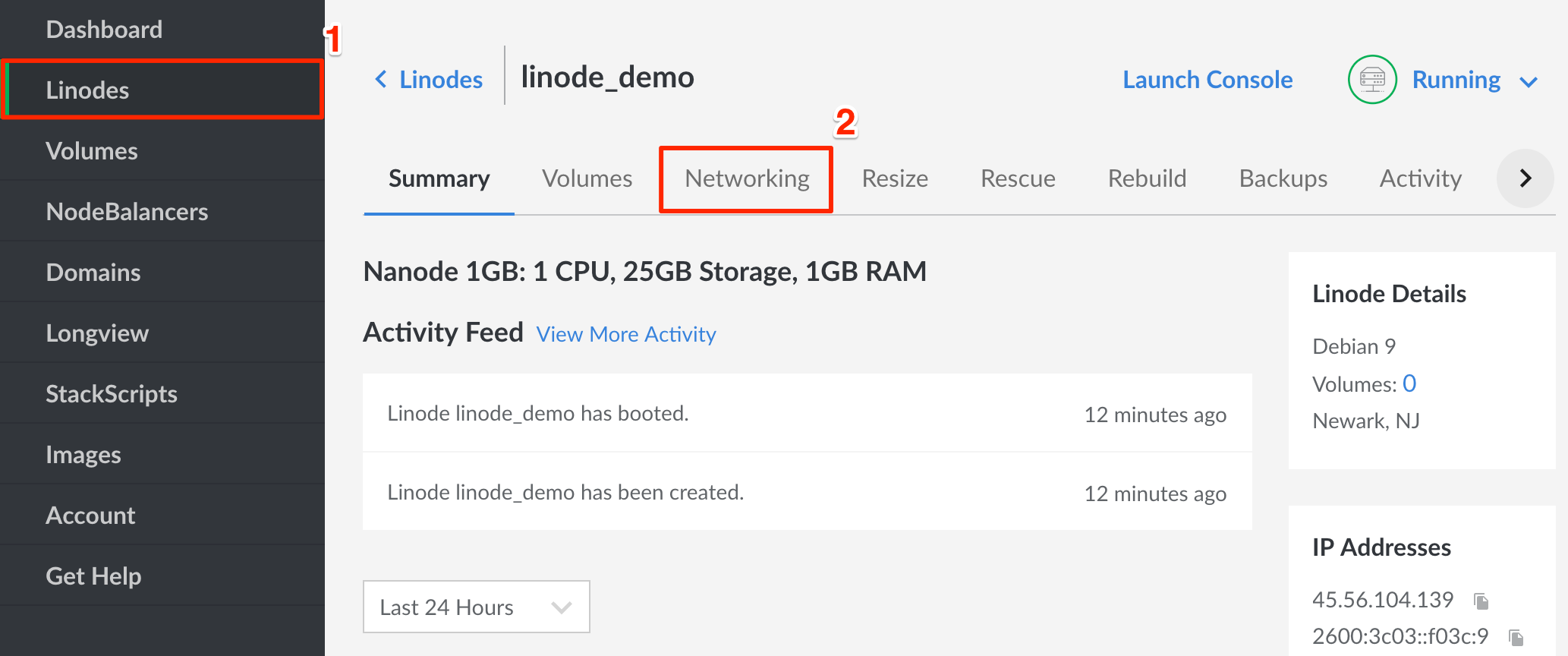To find the networking information for each of your Linodes in your Linode Manager, click on the Linodes tab to the left of the page, select the Linode you’ll be configuring, then click on the Networking towards the top.