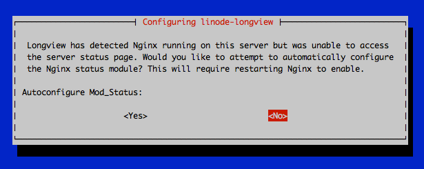 Longview has detected Nginx running on this server but was unable to access the server status page. Would you like to attempt to automatically configure the Nginx status module? This will require restarting Nginx to enable. Autoconfigure Mod\_Status: \<Yes\> \<No\>