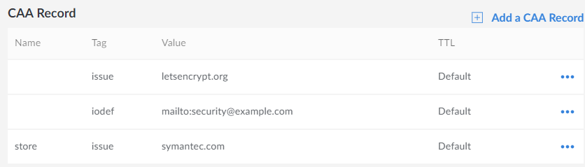 uses a Symantec certificate, you would need two different CAA records. A reporting URL for the iodef tag would also need its own record. Those three would look something like this: