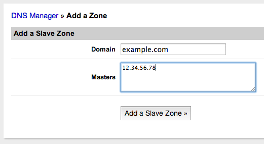 On the slave zone page, you’ll want to enter your domain name in the “Domain” box and your cPanel server’s main IP address in the “Masters” box.