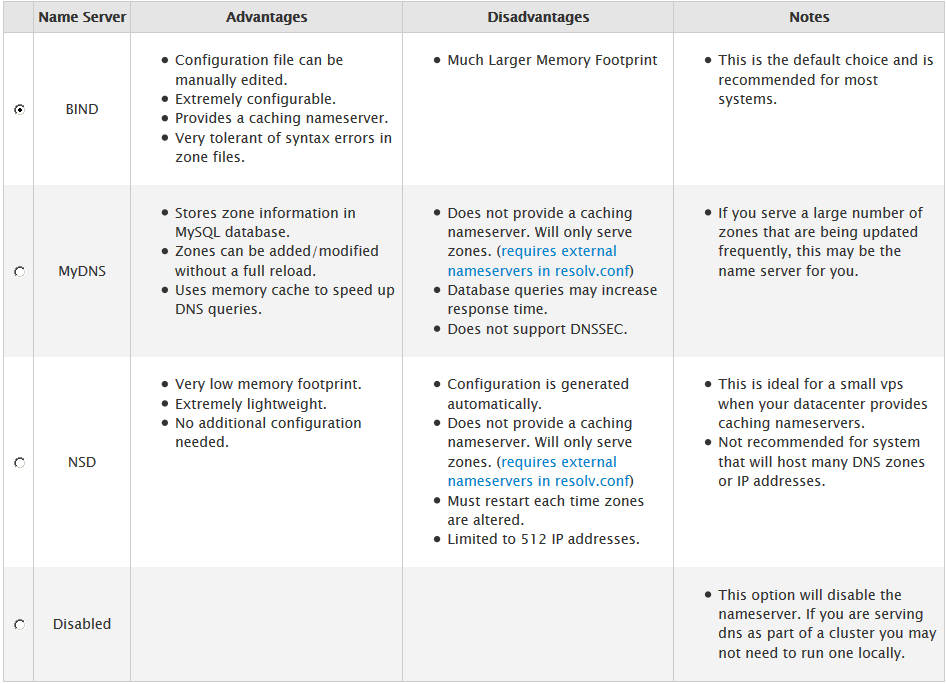You can choose from BIND, MyDNS or NSD; the advantages and disadvantages for each are displayed. If you are unfamiliar with any of them, select BIND, which will be the easiest to work with.
