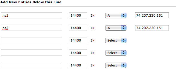 Simply click the domain you used when you set up your nameservers at your registrar and click the Edit button to get to the DNS Editor screen. On the DNS Editor screen, you will want to add A records for your nameservers. To do this, you will fill in the spaces at the bottom of the screen like so: